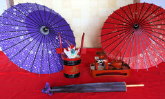 照明3機、番傘大小、毬2個、和装用ブーケ2個、赤毛氈、髪飾り、お屠蘇セット、祝い樽が常備してあり、ご自由にお使いいただけます